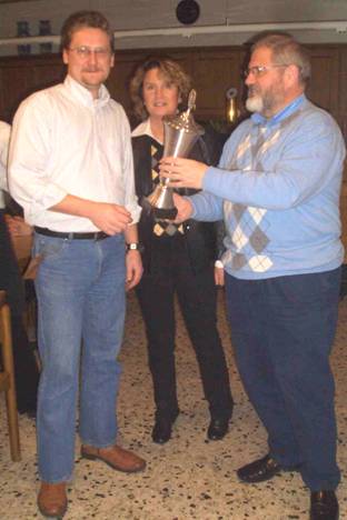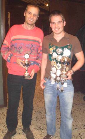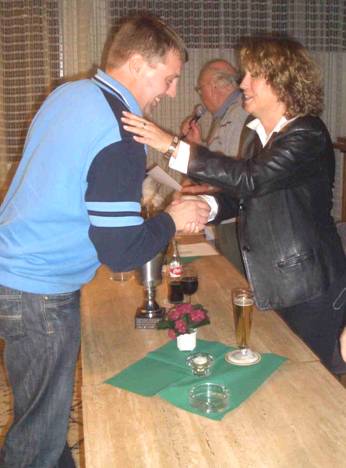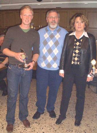 Karsten Sandhofe, Simon Roschkowski, Marvin Streck mit dem Königspaar Hermann I. und Marlene I. Der Vorsitzende begrüßte die Teilnehmer der Siegerehrung für die Vereinsmeisterschaft 2008 in der Stadthalle Waltrop und bedankte sich bei den Schießwarten Alfons Schäfer, Franz Konieczny, Rüdiger Schillinger und bei allen Kompanieschießwarten für die gute Organisation der Meisterschaften. Über 3 Tage hatten die Schützen die Scheiben fest im Visier und der Ehrgeiz bei über 100 Teilnehmern war riesig. Das Königspaar überreichte über 50 Pokale und Auszeichnungen an die Sieger und Placierten.