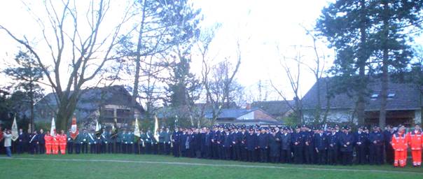 Alle Feuerwehrleute und Gäste marschierten gemeinsam mit dem Spielmannszug Heimatklänge Waltrop und dem Elmenhorster Blasorchester zum Ehrenmal. Nach der Kranzniederlegung folgte der Zapfenstreich.