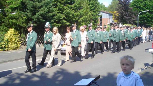 Adjutant Norbert Schrader vor dem Königspaar Manfred I. Müller und Gabriele I. Zielke mit Hofstaat und ihren Schützen während der Prozession