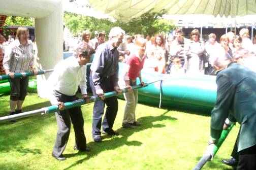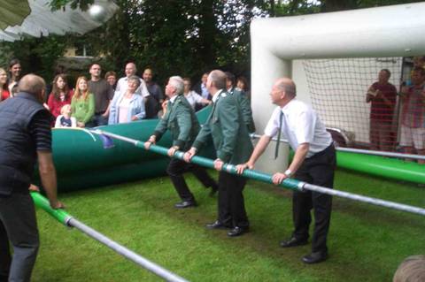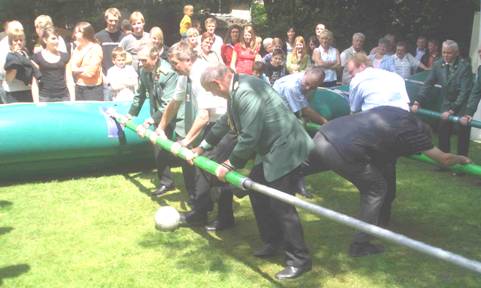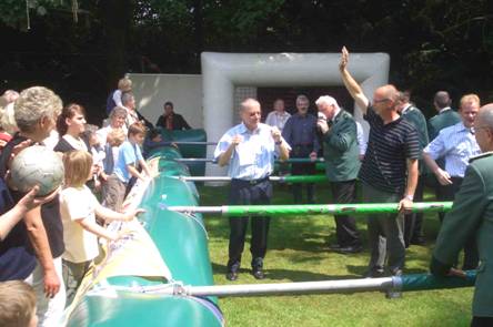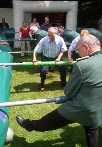 Um 14:30 Uhr standen sich die Schützen und die Waltroper Geistlichkeit im Fußball gegenüber. Die Hände in Schlaufen und die Bewegungsfreiheit war nur seitlich gegeben, entwickelte sich zwischen den Mannschaften ein spannendes Spiel.