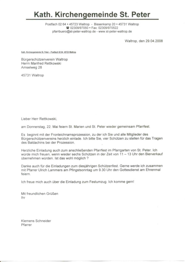 Die Schützen treten am Donnerstag, 22.05.2008 mit Königspaar, Hofstaat, Fahnenabordnung und Vorstand um 09:45 Uhr an der Friedhofskapelle an. Nach der Prozession sind alle Schützen zum Pfarrfest im Pfarrgarten von St. Peter eingeladen.