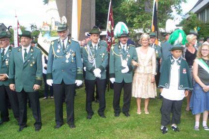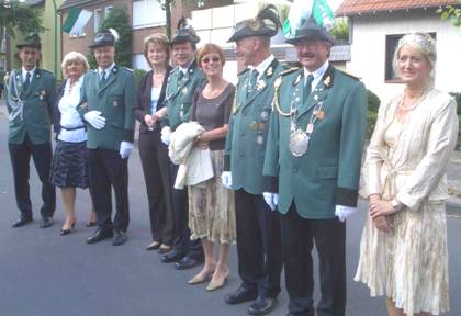 Das Waltroper Königspaar mit Adjutant neben dem Jugendschützenkönigspaar von Horneburg, dem Vors. der Schützengilde Rapen, Wolfgang Höntzsch und dem Vors. des BSV Horneburg, Lutz Breuckmann, bei dem Zapfenstreich vor der Kirche.