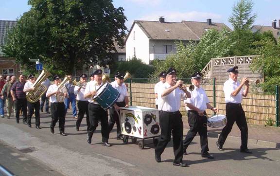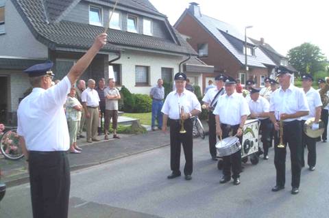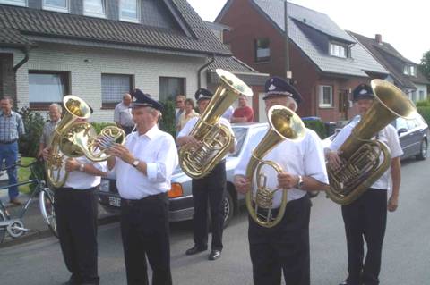 Alle Feuerwehrsenioren trafen sich bei Heinz Holtermann und marschierten dann durch die Braßkampsiedlung zu Bernhard Heckmann. Den Taktstock übernahm Leo Balan.