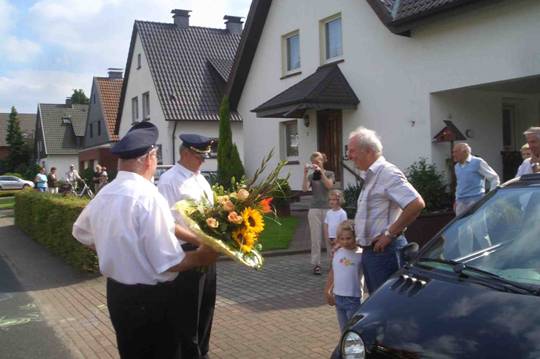 Gratulation mit Blumenstrauß vor dem Haus von Bernhard Heckmann