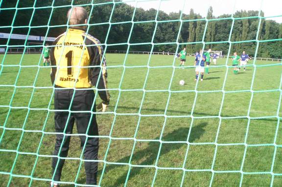 Elfmeter für die Schützen – Jürgen Schmidt verwandelt zum Ausgleich gegen den Torwart der Feuerwehr – Wiesnewski.