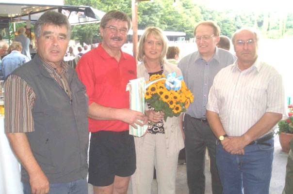 Willi Hedtrich, Dieter List und Uwe Noak vom Veranstalter VFB Waltrop bedankten sich bei dem Waltroper Königspaar Manfred und Gabi für die gelungene Unterhaltung und Auflockerung des Bernhard Stromberg Gedächtnis Turniers mit einem Blumenstrauß und einem erfrischenden Geschenk.