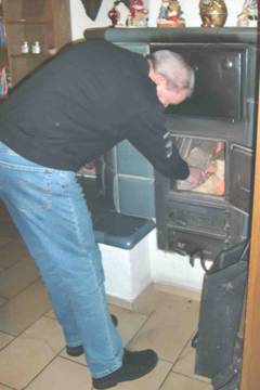 Peter Kerker entfacht das Kaminfeuer und