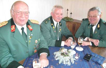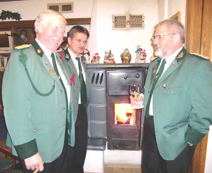 Hauptmann Klemens Meßmann, Generalsadjutant Frank Wesselbaum und EX König Dr. Hermann Geldmann vor dem knisternden Kamin