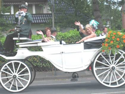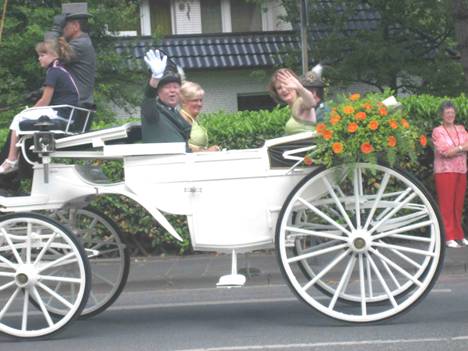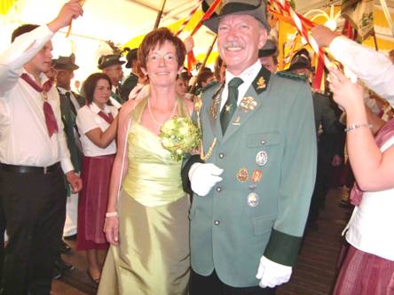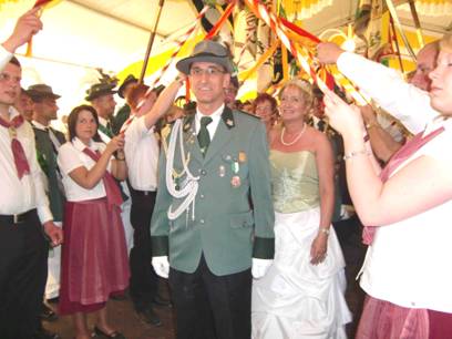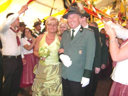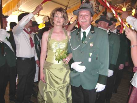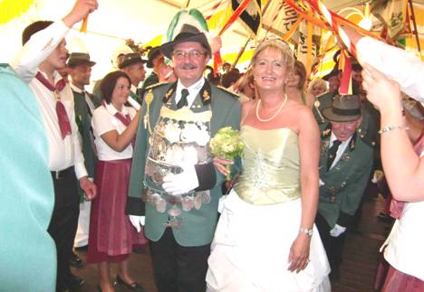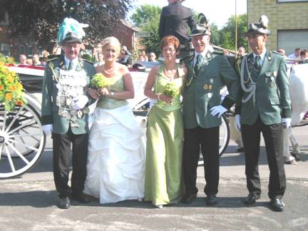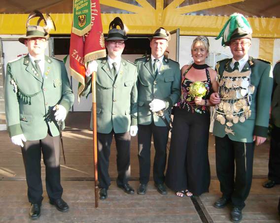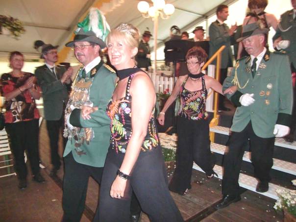 Königspaar mit Hofstaat, Adjutant, General und Btl. Kassierer vor dem Einmarsch ins Zelt zum Königsball des neuen Königs