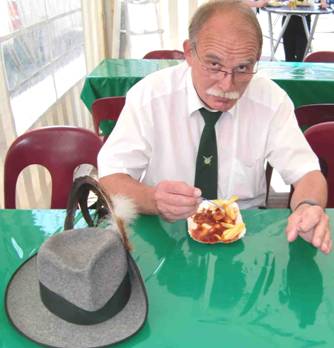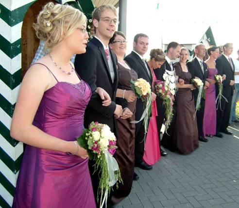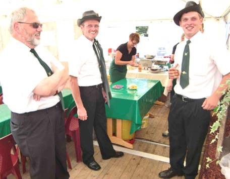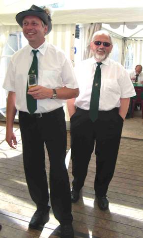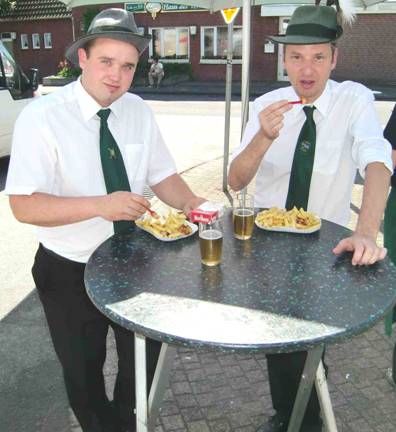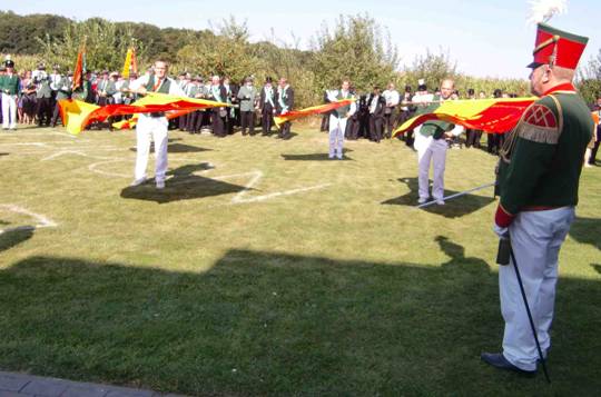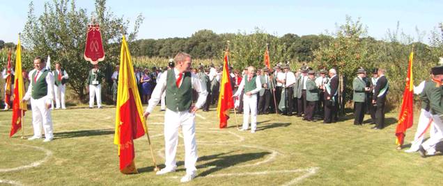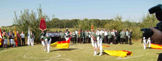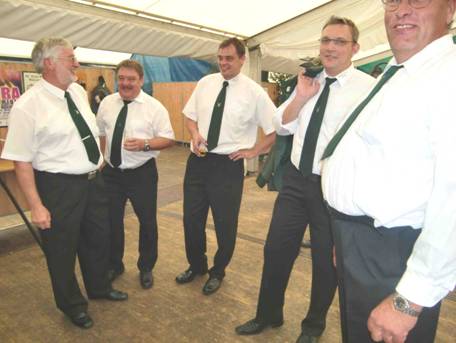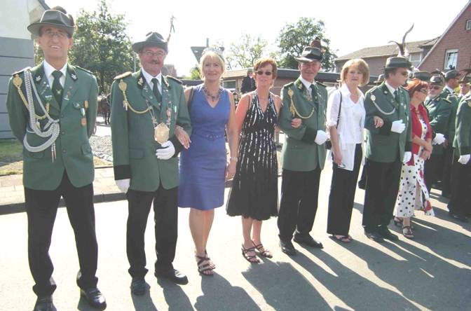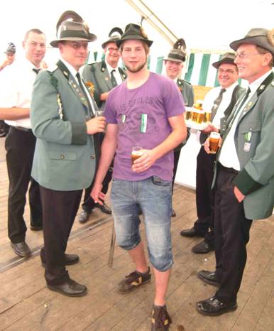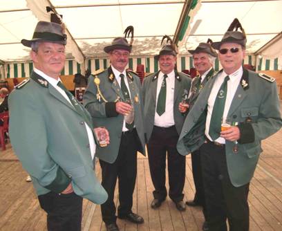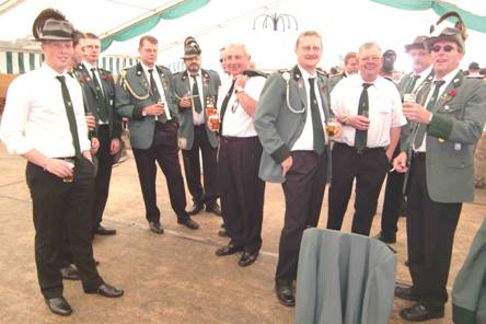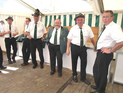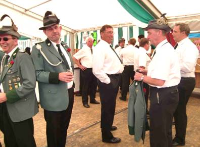 Etwas gewöhnungsbedürftig war die Kleidung der Südlohner Schützen für uns. Schützenhut und Holzgewehr, sonst war die Kleiderordnung egal. Ob kurze Hose, lange Hose, Hemd oder T-Shirt, Turnschuhe oder Sandalen, alles war erlaubt.