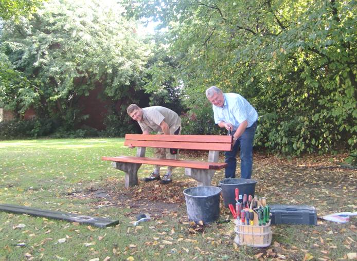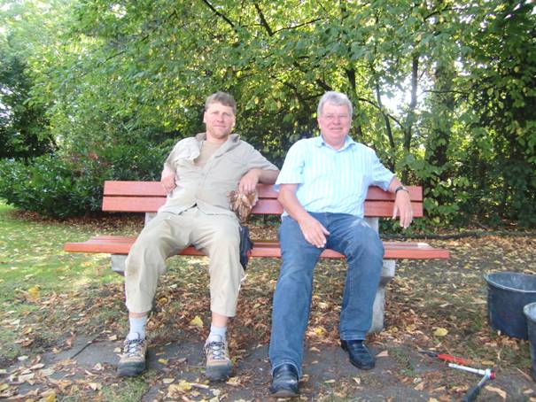 Vor 2 Monaten fragte der Vorsitzende Manfred Rettkowski die Bürgermeisterin Anne Heck-Guthe ob der Bürgerschützenverein Waltrop die völlig verdreckten und defekten Bänke am Ehrenmal und Kriegerdenkmal mit neuen Holzbalken renovieren dürfte. Die Bürgermeisterin sagte sofort zu und die Arbeiten konnten beginnen. Manfred Rettkowski und Bernd Goer begannen vor 14 Tagen mit der Arbeit. Bernd besorgte die Balken und der Vorsitzende übernahm den Anstrich und das Beizen der Holzauflagen. Heute, Mittwoch, 26.08.2009, bauten Bernd und Manfred die alten Balken ab, reinigten die Betonständer vom Grünspan und brachten die neuen Holzbohlen an. Viele Spaziergänger und die Bürgermeisterin lobten das Engagement des Bürgerschützenvereins und freuten sich, dass die Bänke wieder einladend aussehen und benutzt werden können.