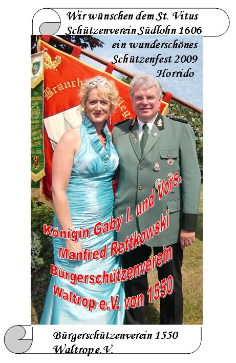 Ausmarsch zum St. Vitus Schützenverein Südlohn 1606 e.V. am Sonntag, 23. August 2009. 71 Schützen mit Königspaar, Hofstaat, Fahnenoffizieren und Vorstand nahmen am Festzug in Südlohn teil. Angemeldet hatten sich 105 Schützen, telef. abgemeldet 19 Schützen und ohne Abmeldung fehlten weitere 15 Schützen.Eigentlich sollte man den fehlenden Schützen ohne Abmeldung den Fahrtkostenpreis in Höhe von 10 Euro in Rechnung stellen. Die I. Kompanie war mit 16 Schützen dabei, II. Kompanie mit 25 Schützen, III. Kompanie mit 4 Schützen, IV. Kompanie mit 12 und die V. Kompanie mit 14 Schützen. Die Abfahrt erfolgte gegen 12:20 Uhr und um 13:30 Uhr wurden wir vom Vorsitzenden Karl-Heinz Tenbrake in Südlohn empfangen. Manfred Rettkowski hatte an alle Waltroper Schützen Jub.-Medaillen vom 450 jährigen Jub. unseres Vereins verteilt. Sie sollten nach dem Festumzug im Zelt an die Schützen des Südlohner Schützenvereins verteilt werden und wurden den Waltroper Schützen aus den Händen gerissen. Nach dem Festumzug gegen 18:30 Uhr überbrachte der Vorsitzende des BSV Waltrop die Grußworte und eine 3 Liter Flasche Waltroper als Zielwasser für das Vogelschießen. Er bedankte sich für die tolle Aufnahme in Südlohn und bei dem Spielmannszug Südlohn für die Unterstützung beim Jubiläumsschützenfest im Jahr 2000 in Waltrop. Ob bei der Feierstunde in der Stadthalle, beim Frühkonzert, bei den Festumzügen oder auf der Vogelwiese, überall haben die Musiker in Waltrop einen bleibenden Eindruck hinterlassen. „Gemeinsam aktiv“ lautet das Motto der Gemeinde Südlohn und das haben wir erlebt wie aktiv die Vereinsarbeit in Südlohn ist. Für unser Königspaar stellte der St. Vitus Schützenverein sogar eine Kutsche bereit.