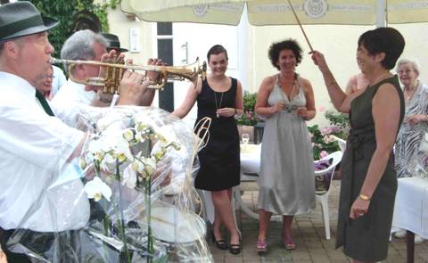 Anneliese dirigierte gekonnt das Blasorchester der Schützen. Tochter Kathrin und Cousine Ursula staunten ob der eleganten Taktstockführung von Anneliese