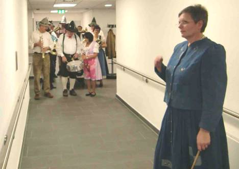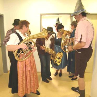 Anne Breddemann und viele Damen vom Pflegepersonal mit Jagdhörnern, Tuba oder anderen Blasinstrumenten fit gemacht.