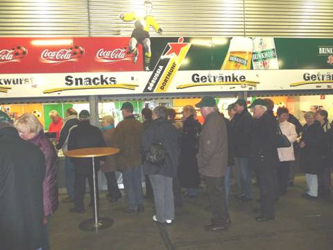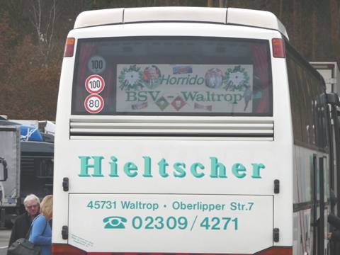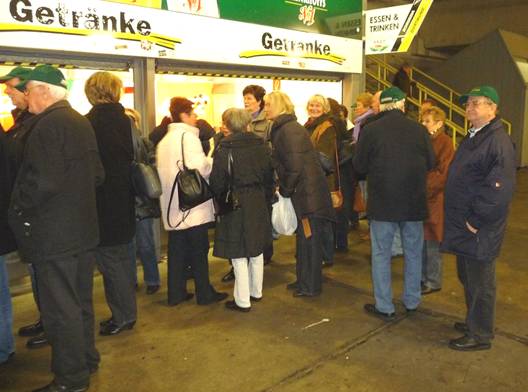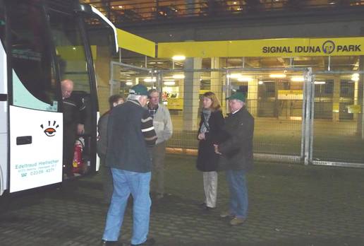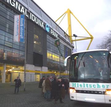 „Ich glaube es nicht!“ war die einhellige Meinung der Mitfahrer. „Manni fährt freiwillig als eingefleischter Schalke Fan ins BVB Stadion zum Frühstück!“ Die Überraschung war gelungen. Die Tore wurden geöffnet und wir fuhren bis ins Stadion hinein.