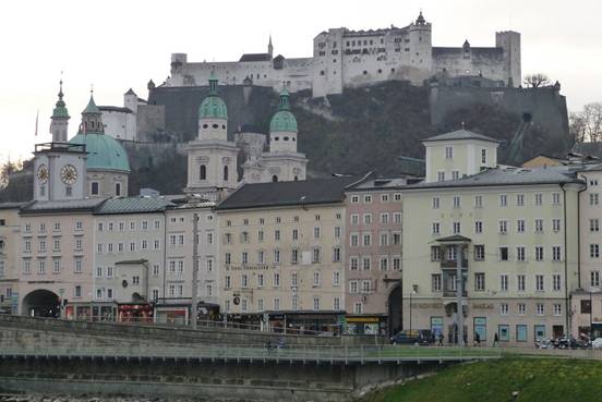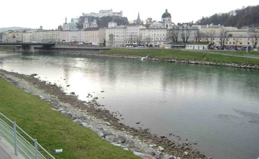 Die Salzach vor dem imposanten Bild der Stadt Salzburg und der Festung Hohensalzburg.