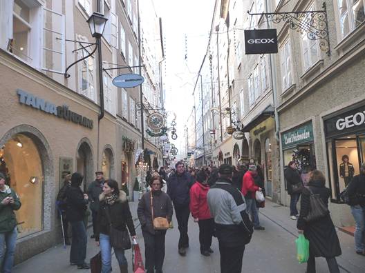 Die Getreidegasse, Salzburgs wohl berühmteste Einkaufsstraße, erhält ihren Charme nicht nur durch hohe, schmale und eng aneinander geschmiegte Häuser, verlockende Geschäfte und schmiedeeiserne  Zunftzeichen, sondern auch durch romantische Durchhäuser und Innenhöfe. Die Bezeichnung der Getreidegasse hat eine eigenartige Wandlung durchgemacht. Ursprünglich hieß sie Trabe-, oder Trave Gasse, das von „traben“, also laufen abstammte, aber auch das Traben der Pferde bezeichnete. Später wurde daraus Tragasse, Traidgasse , und über Getreidgasse schließlich Getreidegasse. Mit dem Getreide hat die Gasse also ursprünglich gar nichts zu tun. Heute zieht vor allem das reichhaltige Angebot von unterschiedlichsten Geschäften die Menschen in die Getreidegasse. Hier gibt es Schmuck, Trachten, die neueste Mode, Antiquitäten, Leder- und Papierwaren, Parfümerien, Feinkosten und einfach alles was das Herz begehrt. Über den Köpfen der Besucher ragen auch heute noch die zierlichen und verspielten Zunftzeichen der Gasthöfe, Geschäfte und Werkstätten. Viele dieser formschönen „Reklamezeichen“ sind besonders kunstvoll gestaltet.