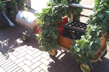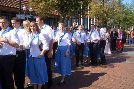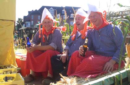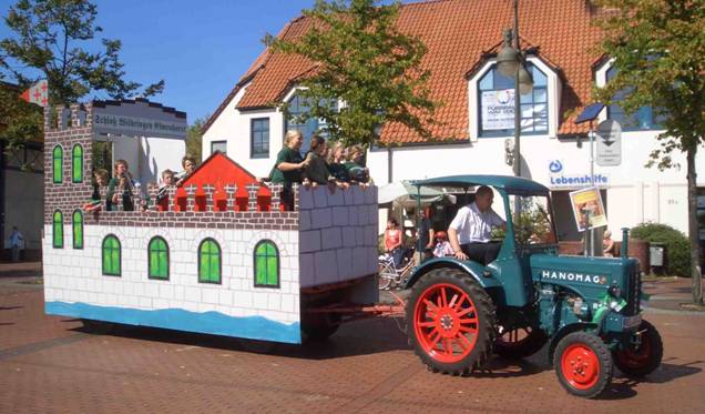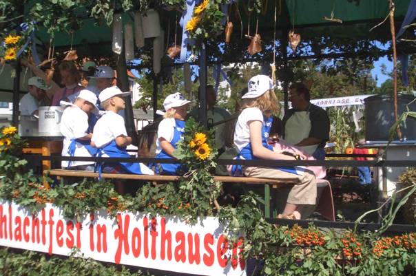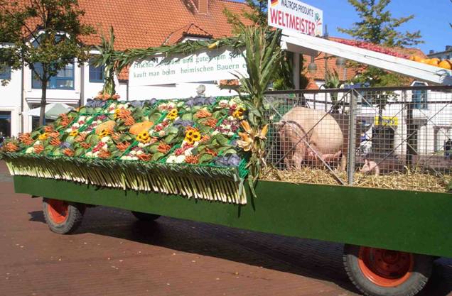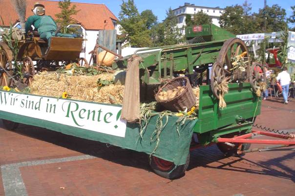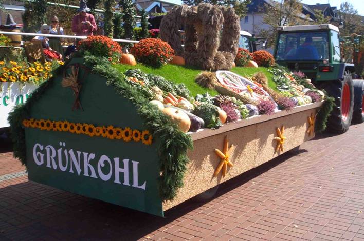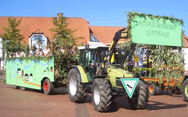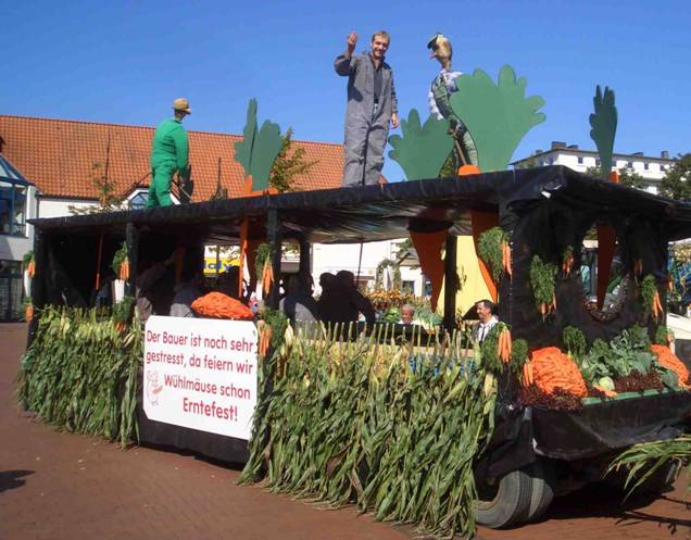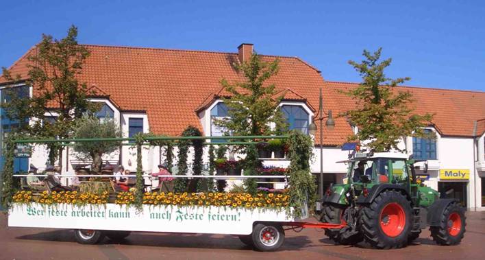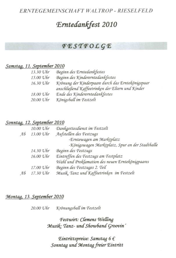 ![]() der Erntegemeinschaft Waltrop-Rieselfeld zum Erntedankfest. Die Schützen treten mit dem Königspaar, Vorstand, General, Oberst und Fahnenoffizieren um 19:30 Uhr an der Kreuzung Borker Str./ Oberlipper Str. an. Das Königspaar würde sich sehr freuen wenn viele Schützen sie auf dem ersten offiziellen Ausmarsch begleiten würden. An diesem Samstagabend ist der Eintritt für alle Schützen in Schützenröcken frei. 6 Biermarken für jeden Schützen werden vom Btl.-Kassierer Erich Fischer im Festzelt ausgegeben. Der Spielmannszug Heimatklänge Waltrop führt alle Vereine gemeinsam um 20:00 Uhr ins Festzelt. Dort beginnt dann der Königsball von Heiner und Ute. Am Sonntag, 12. September 2010, startet der Festzug um 14:30 Uhr. Aufstellen der Erntewagen und Königswagen auf dem Raiffeisenplatz ab 13:00 Uhr. An diesem Festzug nimmt vom BSV Waltrop nur das Königspaar mit Hofstaat teil. Anschließend folgt die Wahl und Proklamation des neuen Erntekönigspaares auf dem Festplatz an der Oberlipper Str. Montag, 12. September 2010, 20:00 Uhr Krönungsball im Festzelt, Eintritt frei.