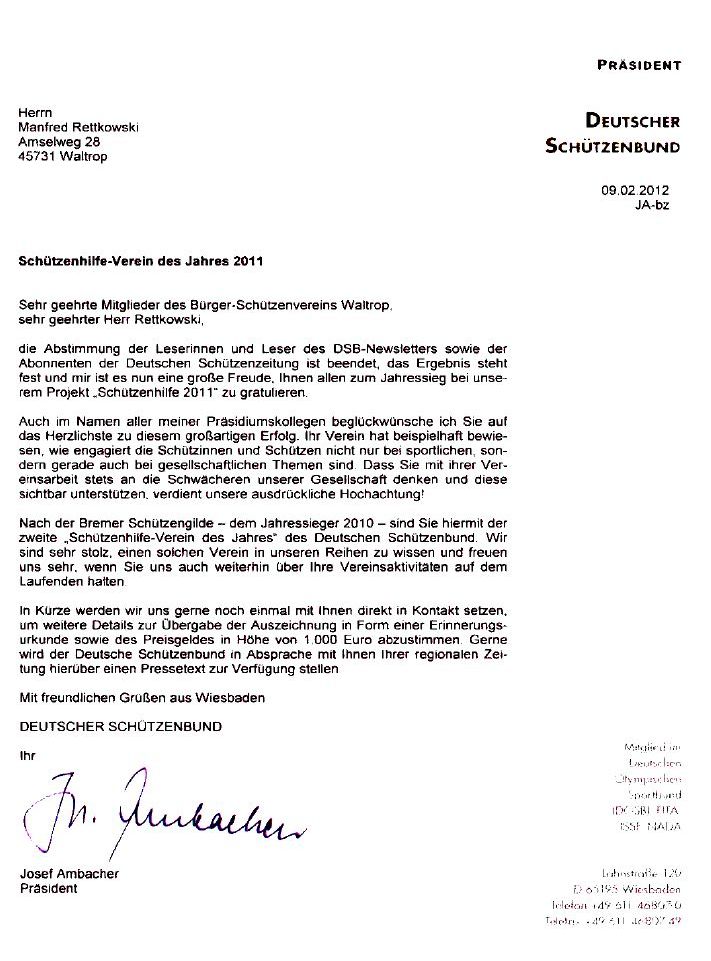 BSV Waltrop ist Schützenhilfeverein des Jahres 2011 !