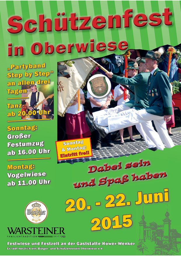 Liebe Schützenbrüder, am Sonntag den 21. Juni 2015 ist der Festumzug des Bürger-und Schützenverein Oberwiese e.V. Treffen ist an der alten Nebenstrasse der Strasse „Am Hebewerk“ gegenüber Boots- und Uferweg um 15.15 Uhr. Angetreten wird dann ca. 15.45 Uhr.